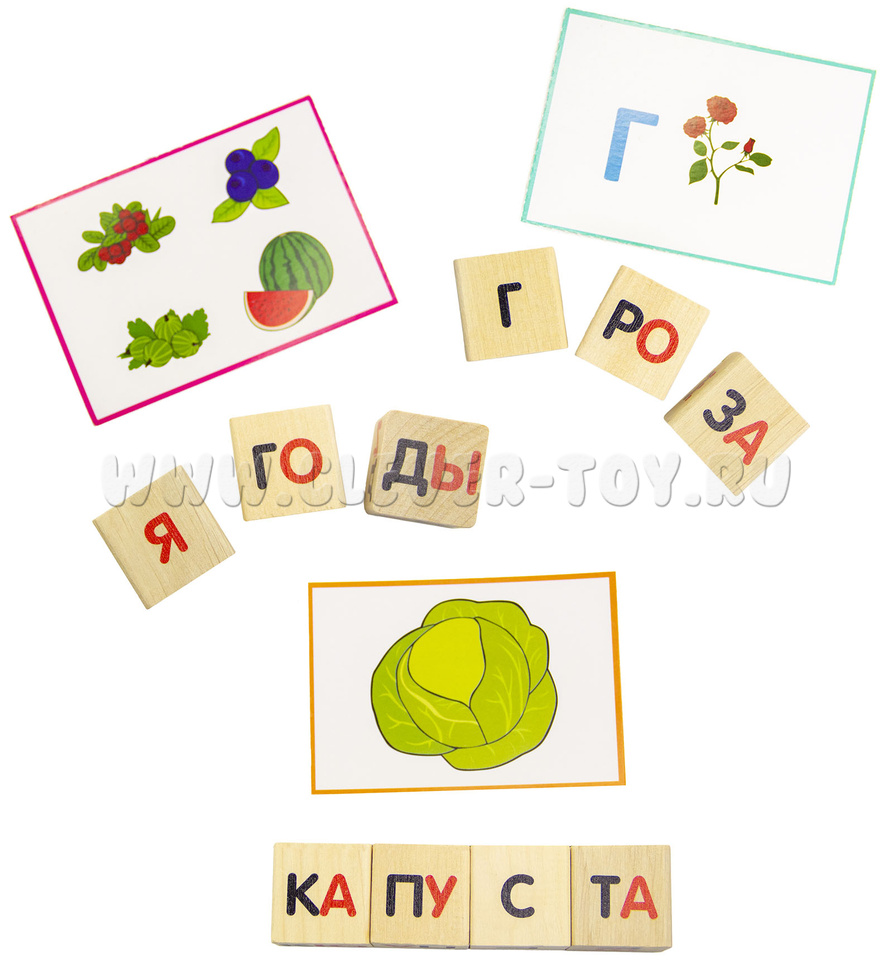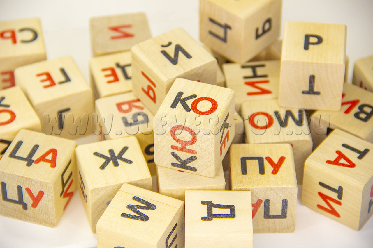 • 25 деревянных кубиков с буквами и слогами,