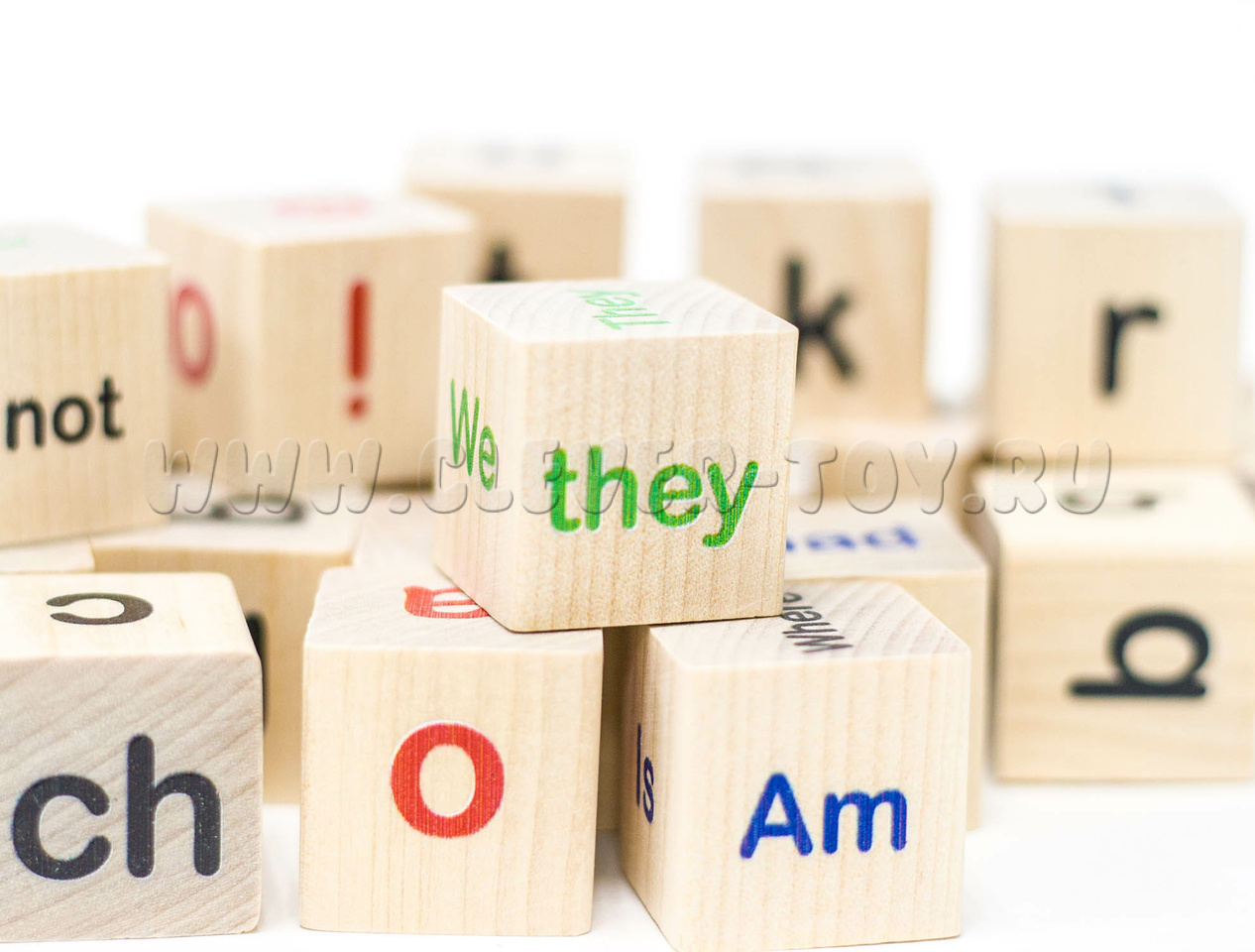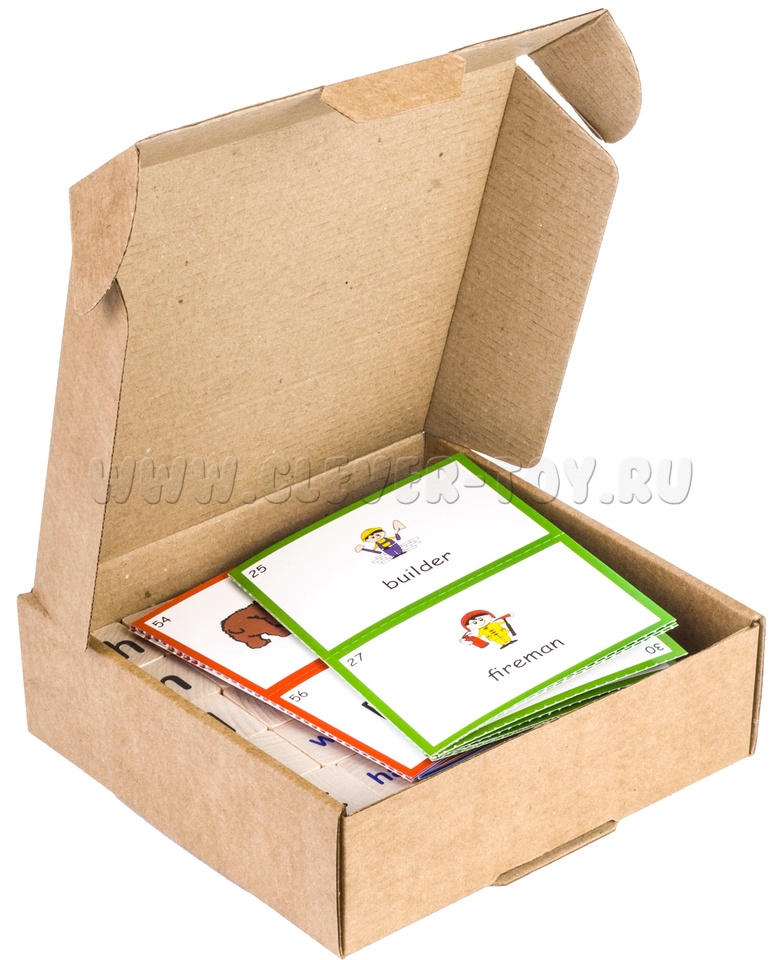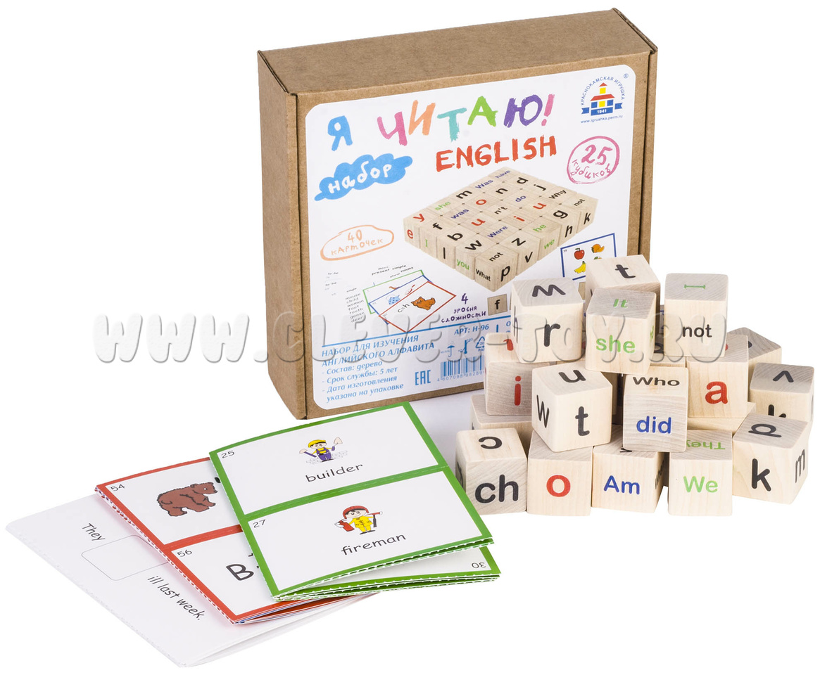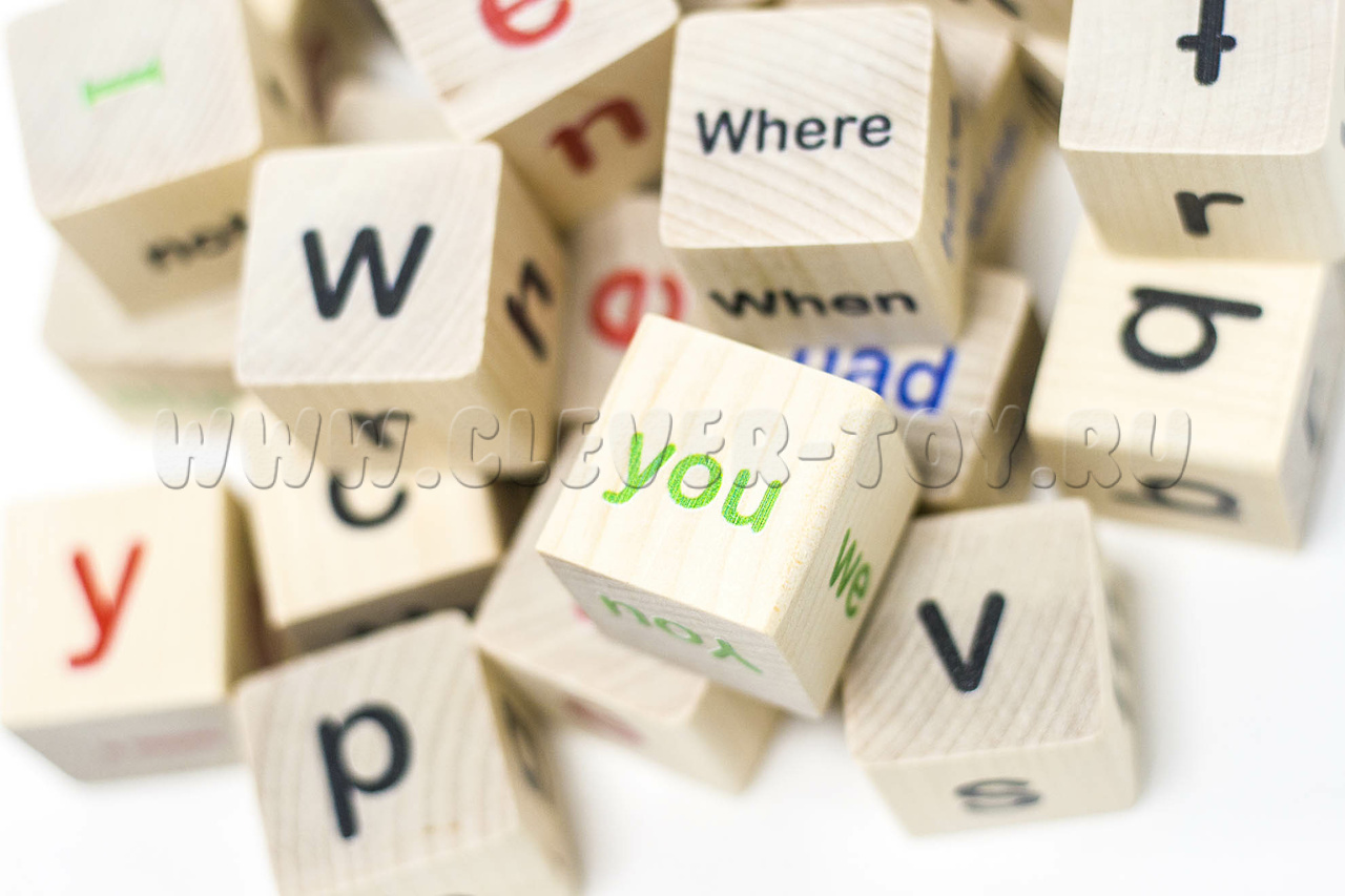 • 25 деревянных кубиков с буквами английского алфавита, сочетаниями букв, местоимениями, глаголами, отрицательными частицами, знаками препинания, вопросительными словами;