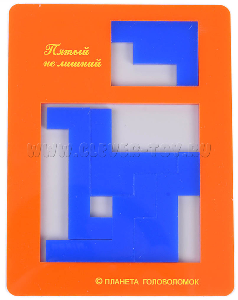 Нужно разместить все элементы в коробочке. Как обычно в таких задачах, элементы можно как угодно поворачивать и переворачивать, но нельзя накладывать друг на друга. При этом общая площадь всех элементов составляет около 80% площади квадратной ниши, так что свободного места для размещения всех пяти элементов достаточно. Однако, задача не так проста. Известно единственное решение этой головоломки.