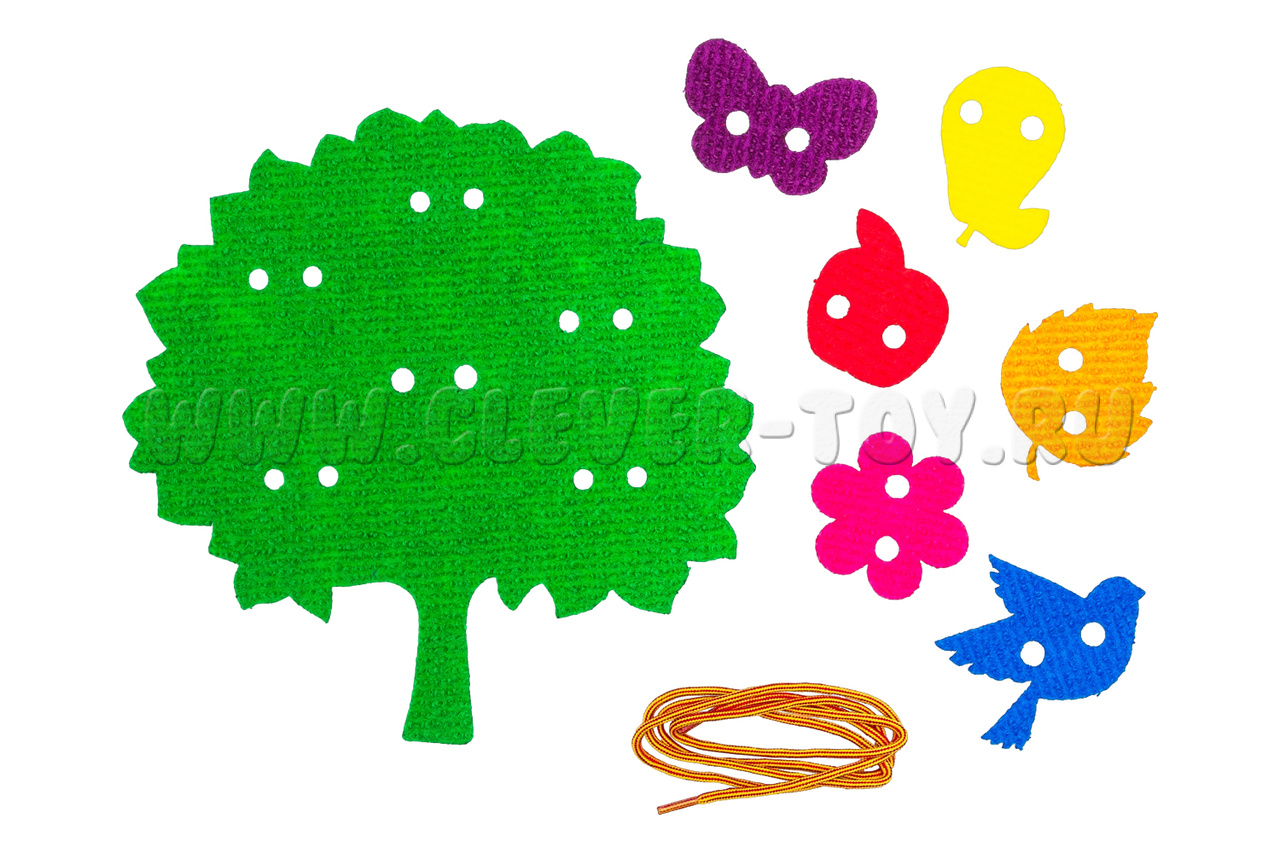 Например, «Украшаем деревце» - игра для самых маленьких. Вместе с ребёнком наложите одну фигуру на другую и соедините с помощью шнурка. Игра «Кто быстрее?» - предложите малышу посоревноваться в том, кто быстрее с помощью шнурка прикрепит все игровые элементы.