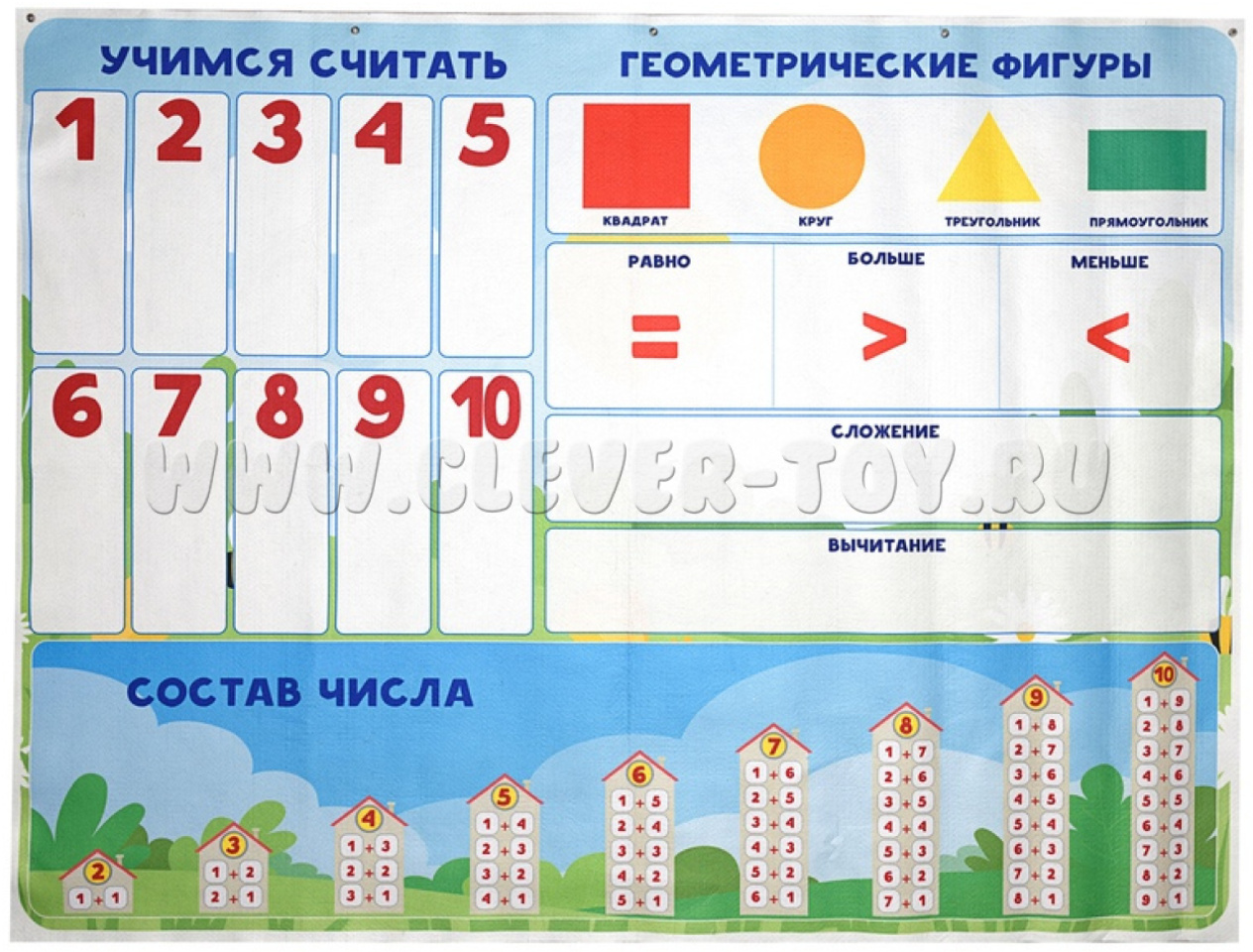 В комплект игры входит игровое поле размером 108x145 см, на котором изображён домик, деревья, кусты и грядки. Также в наборе есть различные фигурки цифр и счётного материала.