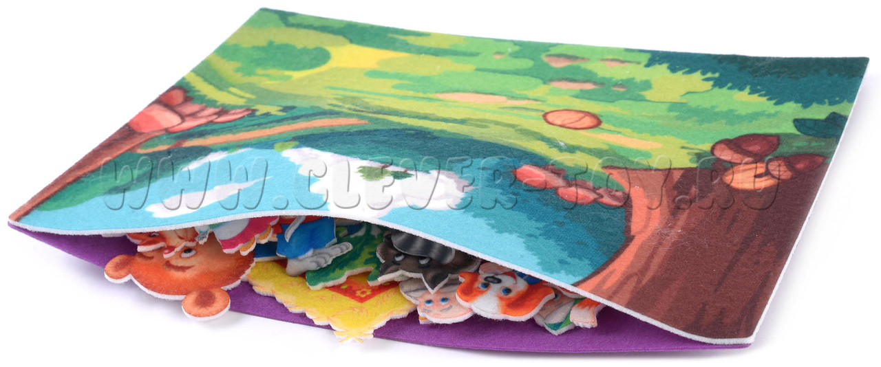 В комплект входят игровые элементы для пяти известных сказок: «Колобок», «Теремок», «Курочка Ряба», «Репка» и «Маша и медведь». Фигурки можно передвигать по полю или прикреплять с помощью липучек.