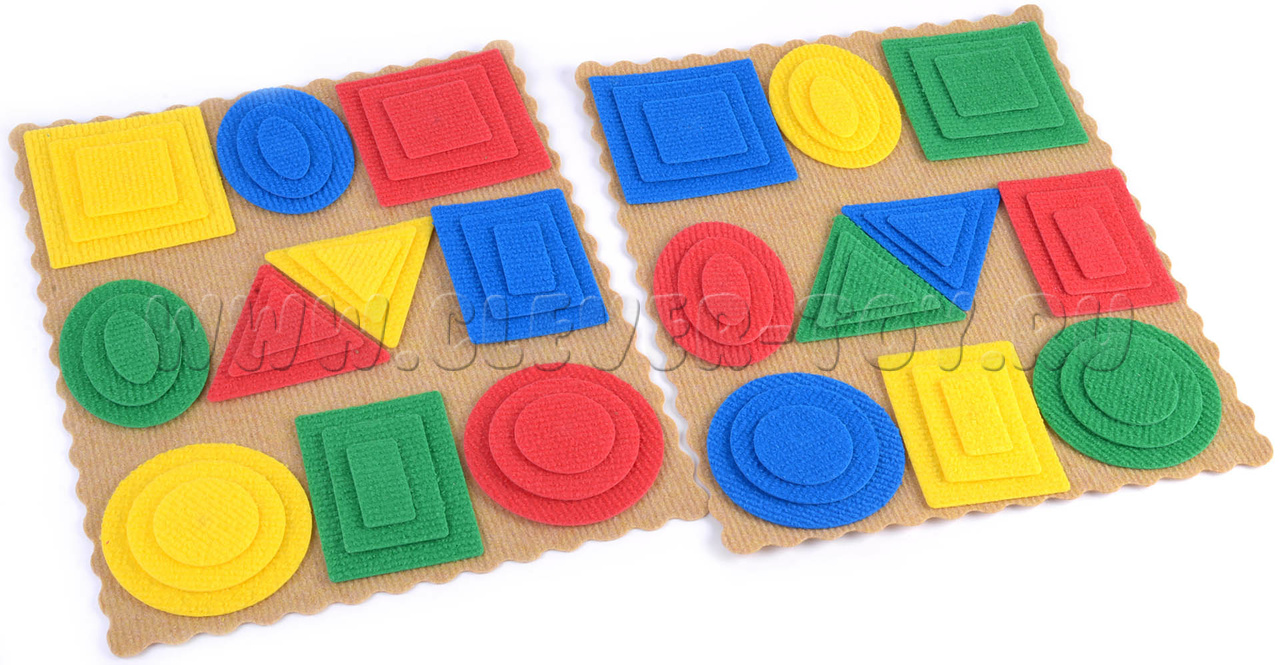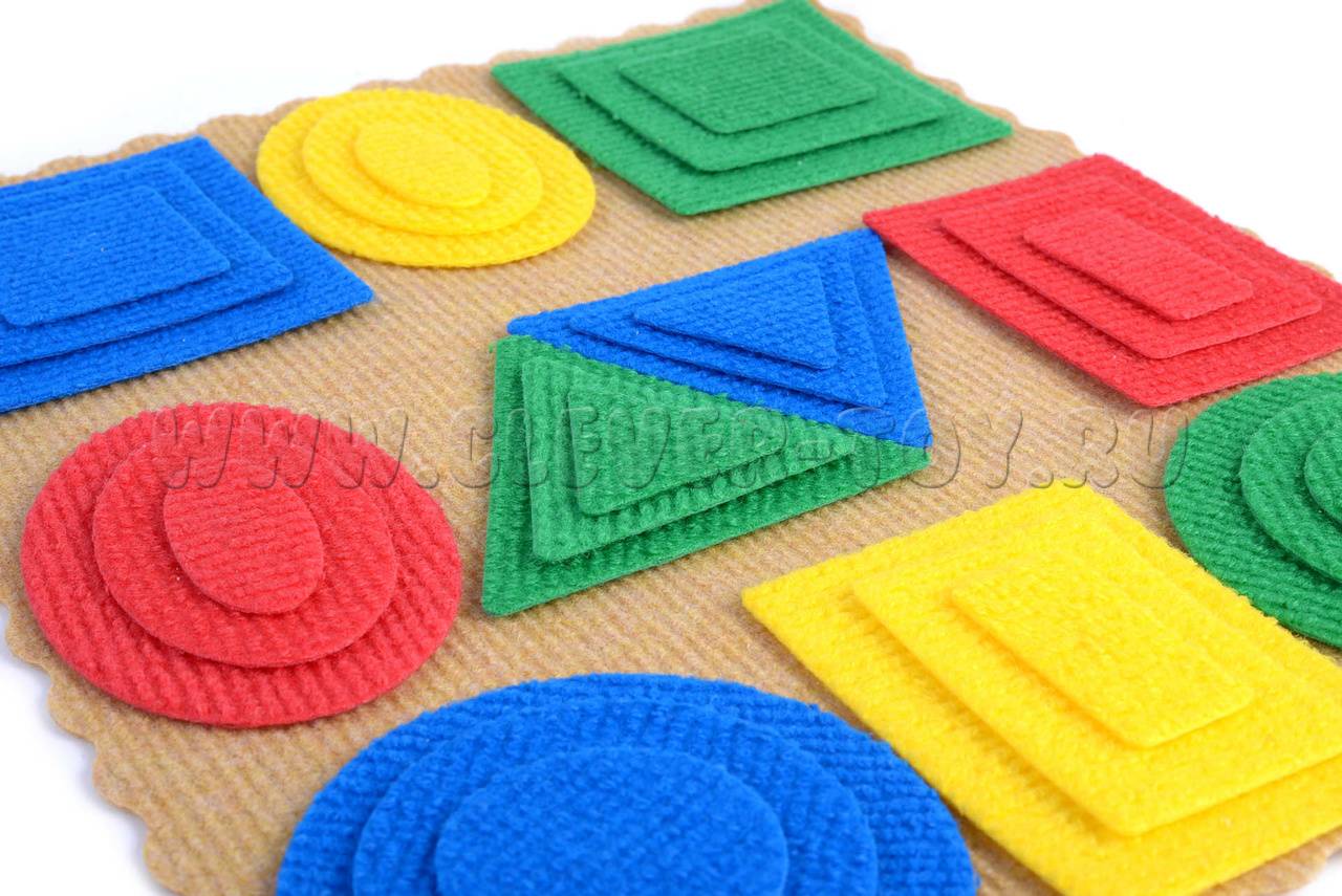 Разноцветные геометрические фигуры выполнены из безопасного современного материала – ковролина, аккуратно вырезаны на специальном станке, легко крепятся на ковролиную игровую основу с помощью многоразовых липучек.