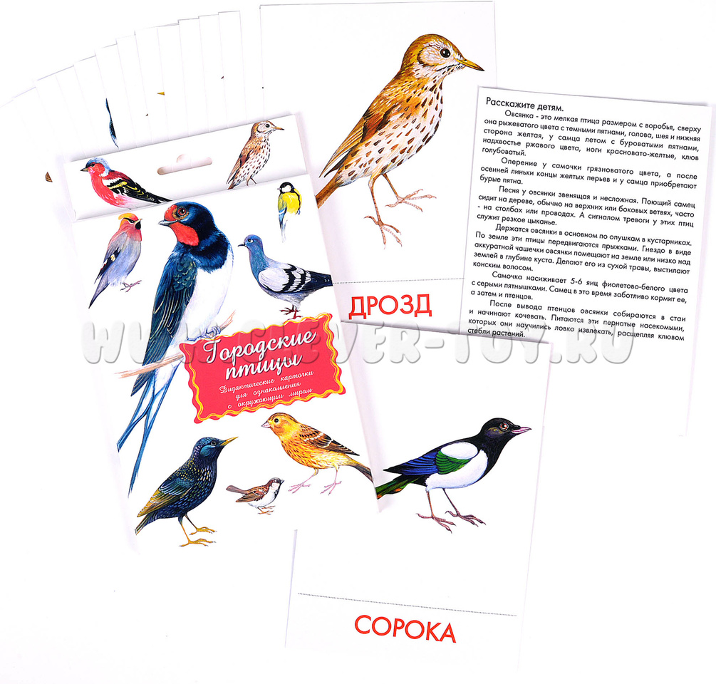В набор входит 16 карточек с изображениями птиц, обитающих в городе: