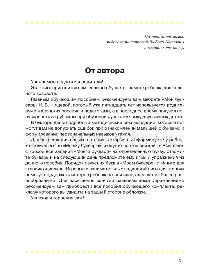 Пособие включено в методический комплект парциальной программы "Обучение грамоте детей дошкольного возраста" (автор Н. В. Нищева) и позволяет автоматизировать навыки чтения, уже сформированные у дошкольников по обучающему пособию "Мой букварь", в игровой форме, с помощью разнообразных развивающих заданий. Выполняя под руководством взрослых указанные задания, малыши будут не только тренировать навыки чтения, но и выполнять звуковой и слоговой анализ слов, пересказывать небольшие рассказы, составлять слова из данных букв и предложения из данных слов.