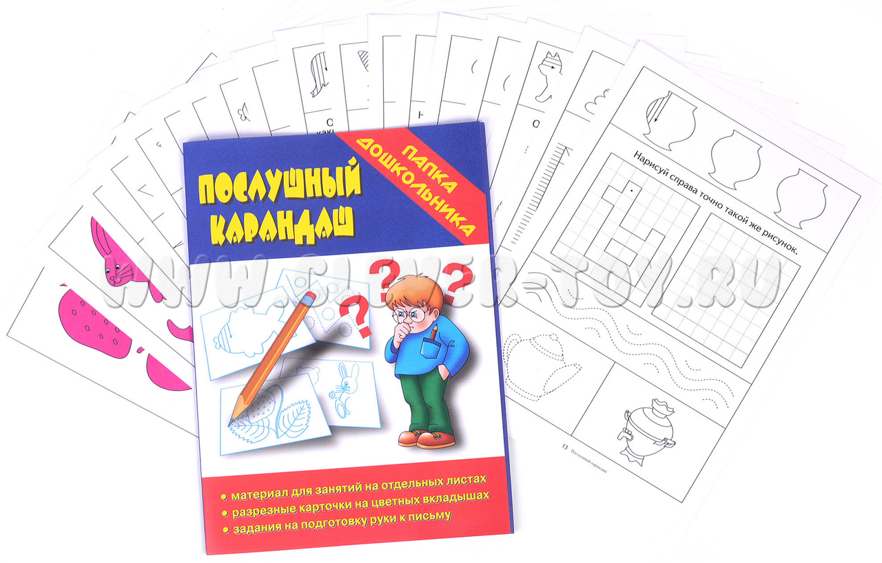 Тетрадь с заданиями на отдельных листах, разрезные карточки на цветных вкладышах, задания на подготовку руки к письму.