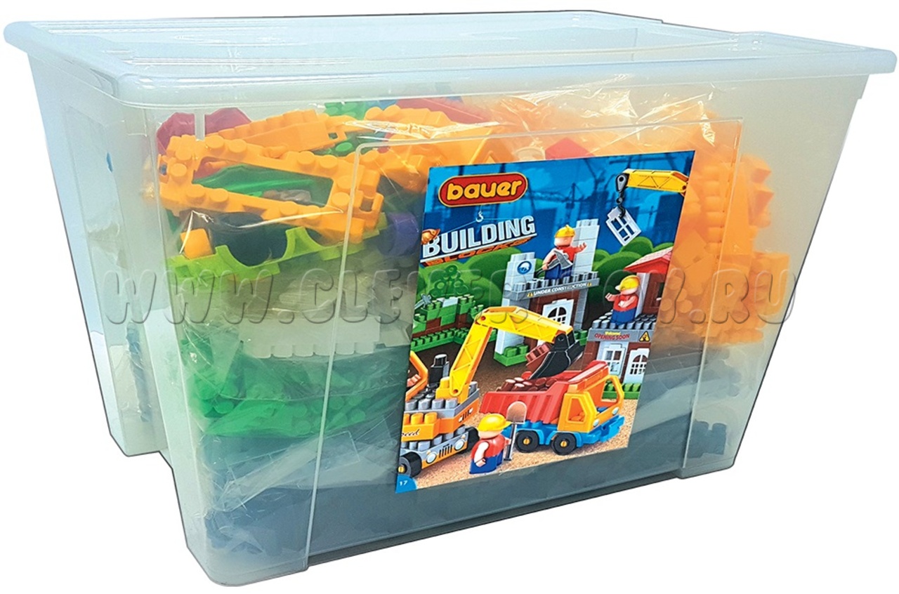 Набор серии «Стройка» совместим с другими наборами от BAUER. В комплект входят: кубики различных цветов и размеров, сборная строительная техника, сборные машинки, фигурки человечков и набор инструментов для них, набор наклеек "Дорожные знаки", элементы декора (дорожные знаки, деревья, светофоры, забор, окна, двери, крыши). Конструктор созданн из безопасного пластика с использованием пищевых красителей.