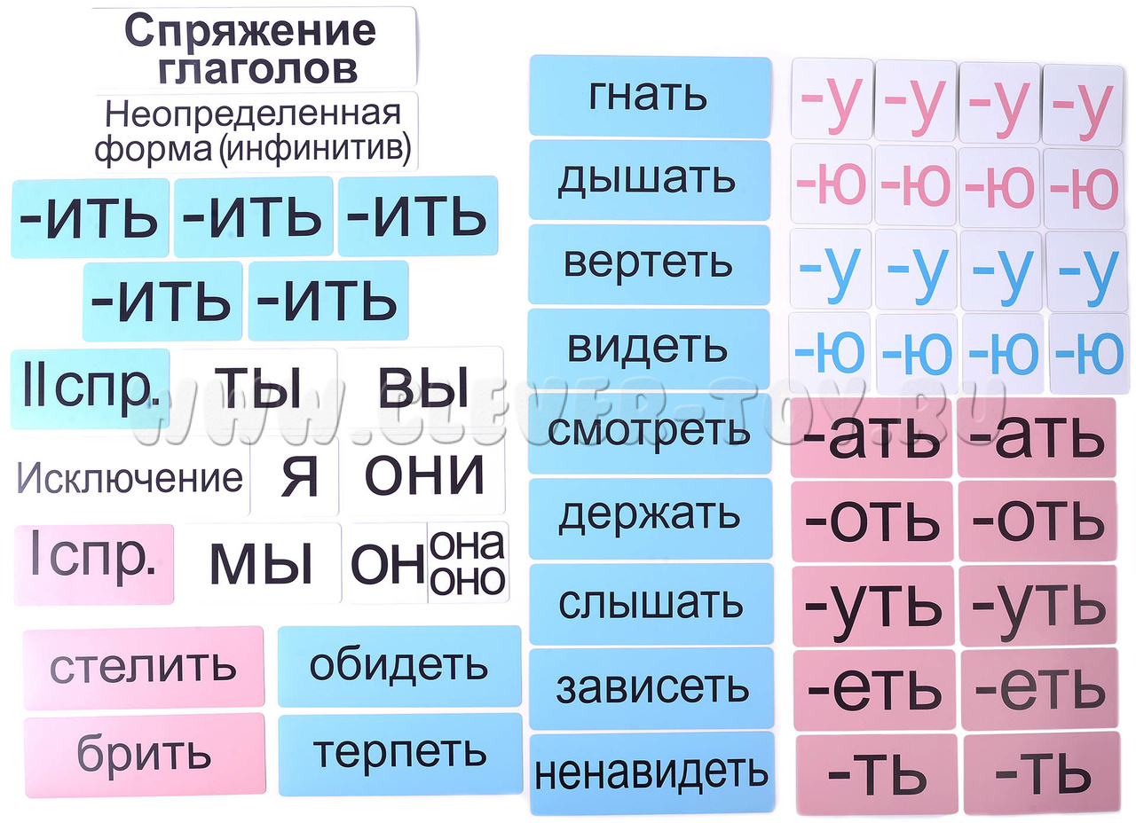 Особенность этого набора заключается в цветовой кодировке: все окончания и исключения глаголов первого спряжения выделены ярким розовым цветом, а второго спряжения – спокойным голубым. Это помогает быстро и легко запомнить правила спряжения и различать их между собой.
