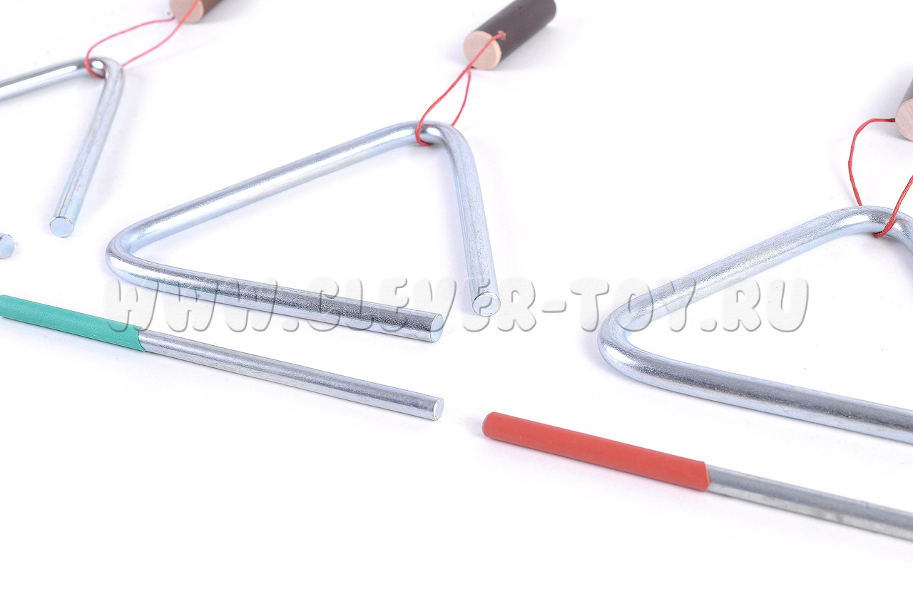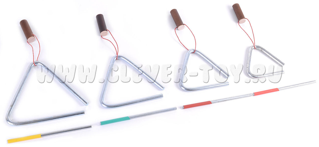 4 музыкальных треугольника (длина стороны - 8, 10, 12, 14 см) с качественной тембральной окраской, благородным и певучим звуком (до 20 секунд).