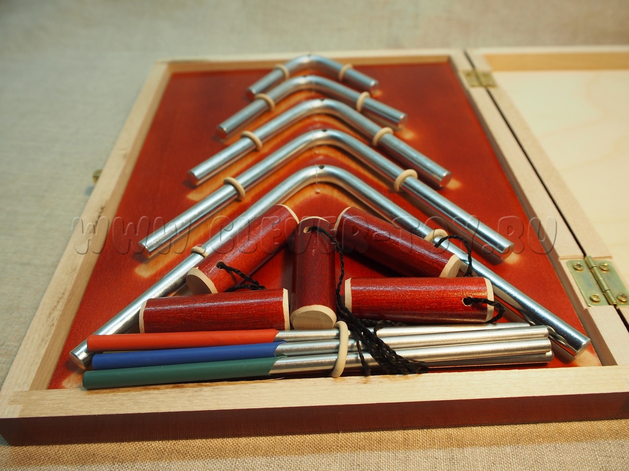 5 музыкальных угольников (длина стороны - 6, 8, 10, 12, 14см) с качественной тембральной окраской, благородным и певучим звуком (до 20 секунд).