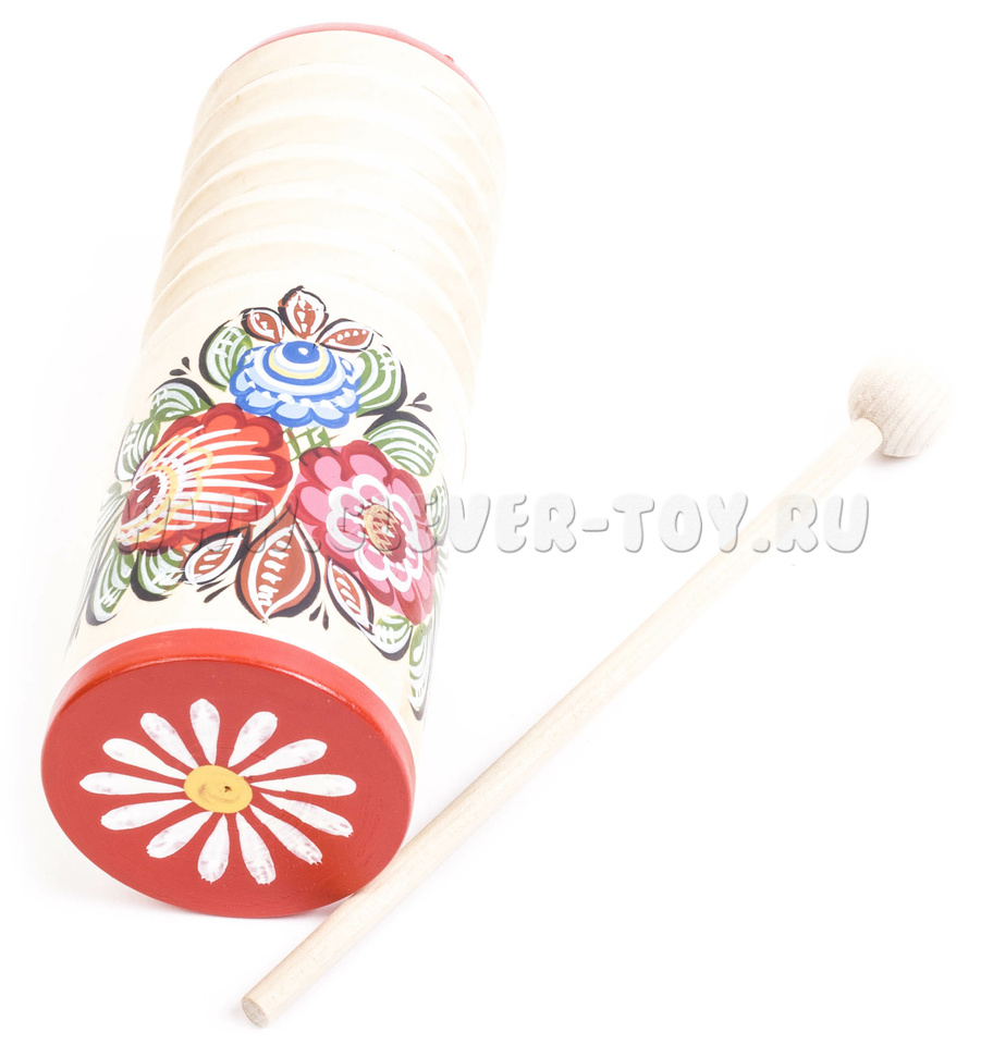 Погремушка представляет собой деревянный цилиндр диаметром 50 мм и высотой 120 мм. Внутри находится полый стакан с охотничьей дробью. Цилиндр с внутренней стороны гладкий, снаружи - ребристый. Канавки под углом 90 градусов выполнены токарным способом. Музыкальный инструмент комплектуется ударной палочкой с шариком на конце. Материал: липа.