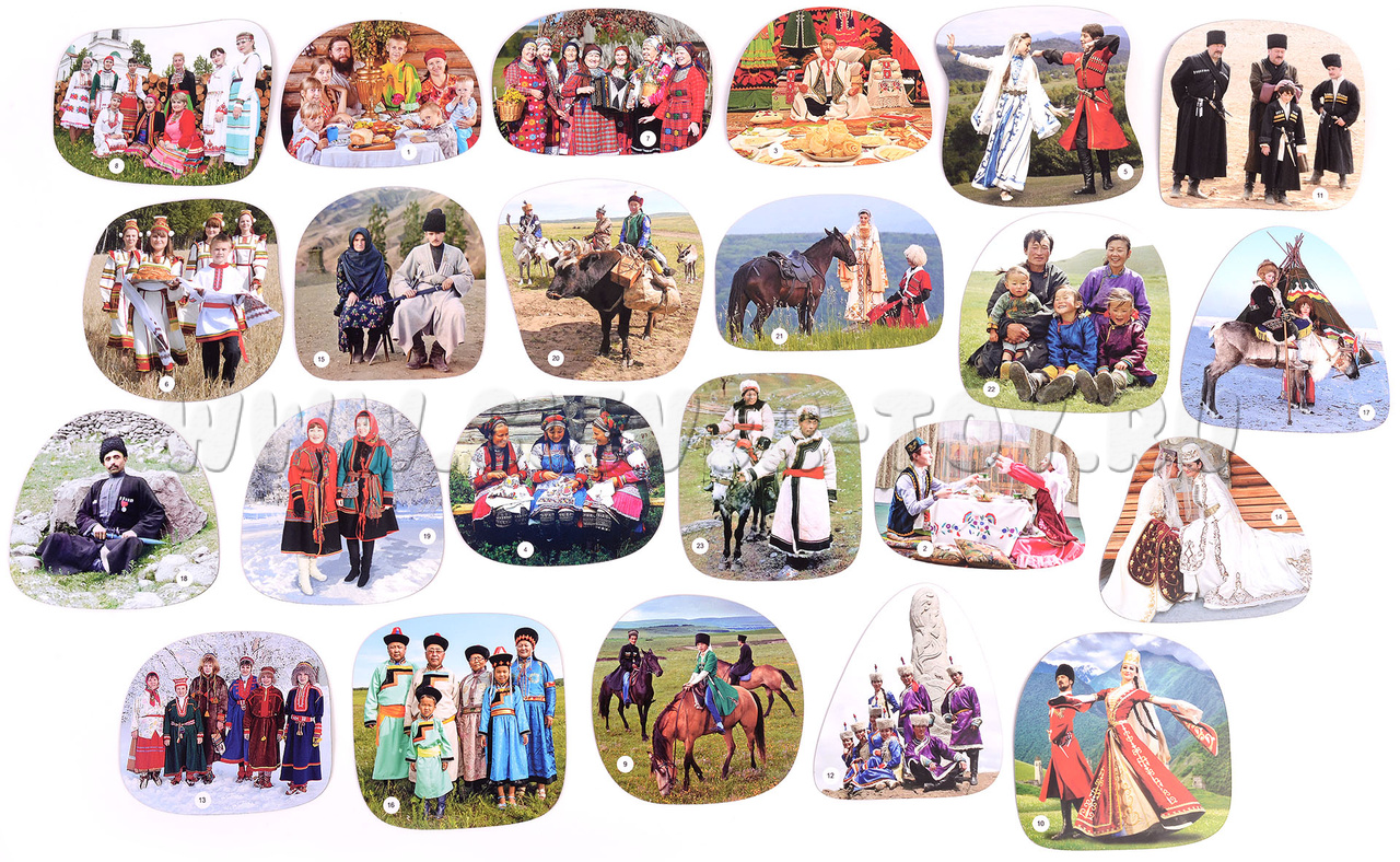 В наборе 23 магнитных карточки, которые рассказывают, о разных народах, проживающих в нашей стране.