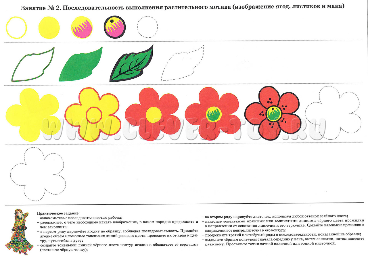 - Последовательность изображения ягод, листиков и мака;