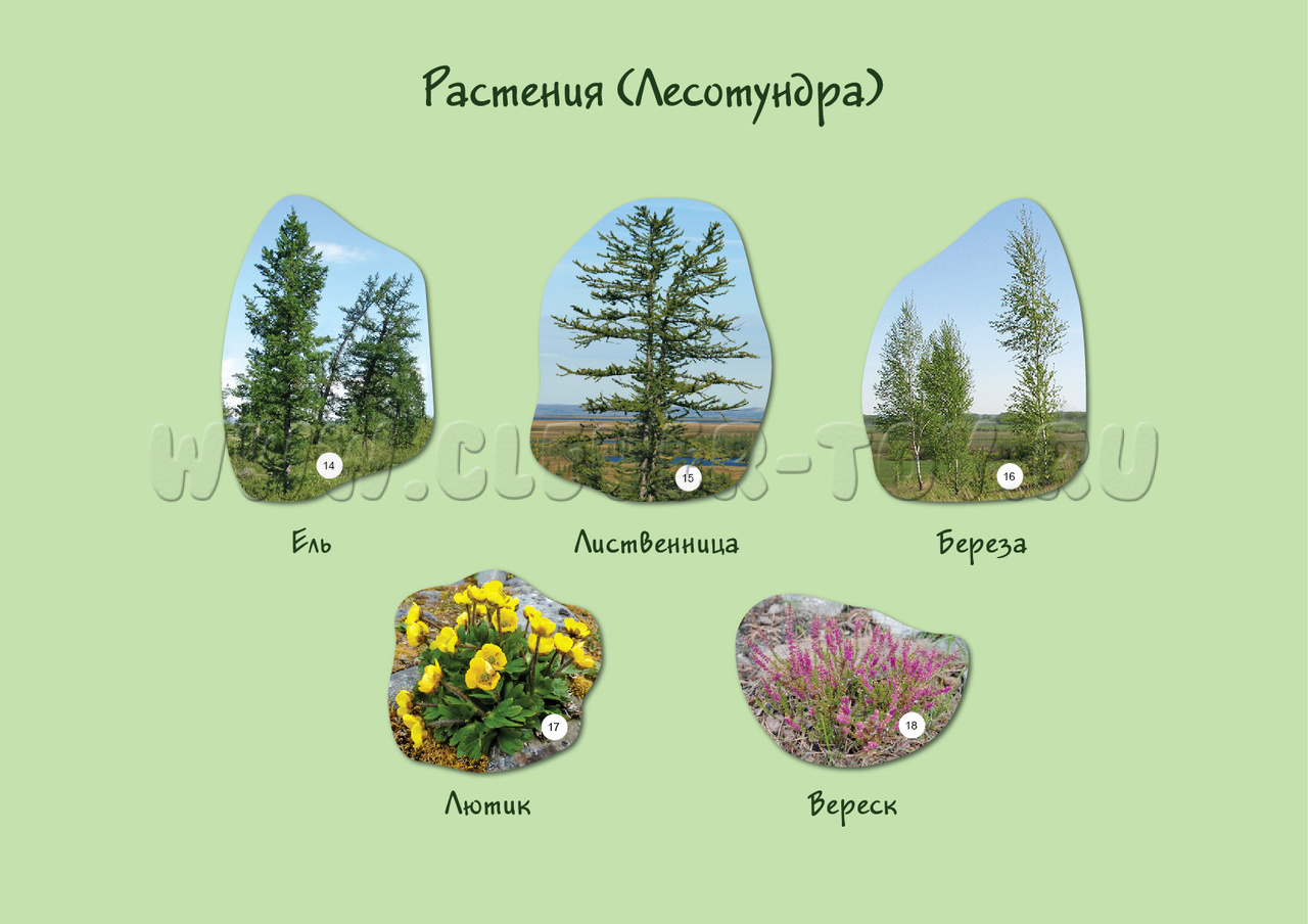 Но и те изображения деревьев, кустарников, цветов, ягод, лишайников, которые вошли в состав набора, внимательному взгляду позволят сделать весьма интересные наблюдения. Например, о том, что, допустим, березы на севере нашей страны, в ее средней части и на Дальнем Востоке сильно отличаются друг от друга. Растения в тундре гораздо более низкорослы, чем в широколиственных лесах. А в степях хозяйничают травы. Если после таких выводов вы зададитесь вопросом "Почему так происходит?", задача нашего пособия будет выполнена.