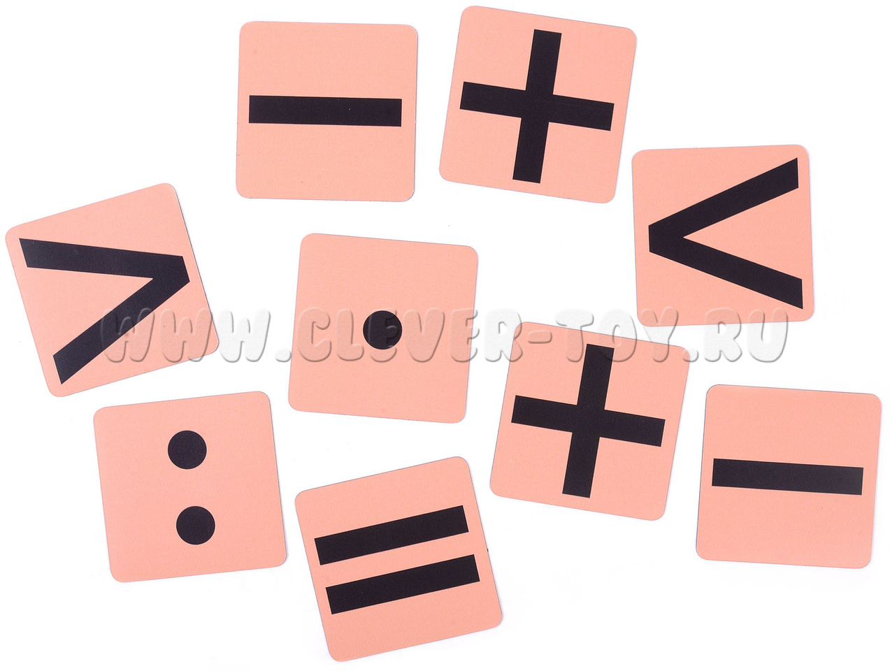 Когда мы, по просьбам учителей начальных классов, выпустили «Числа от 1 до 20», нам ничего не оставалось, как укомплектовать их знаками действий. Ведь это следующий важный шаг в освоении арифметики. Знаки действий мы выпускаем на оранжевом либо фиолетовом фоне, в каждом наборе 9 карточек, вот таких: