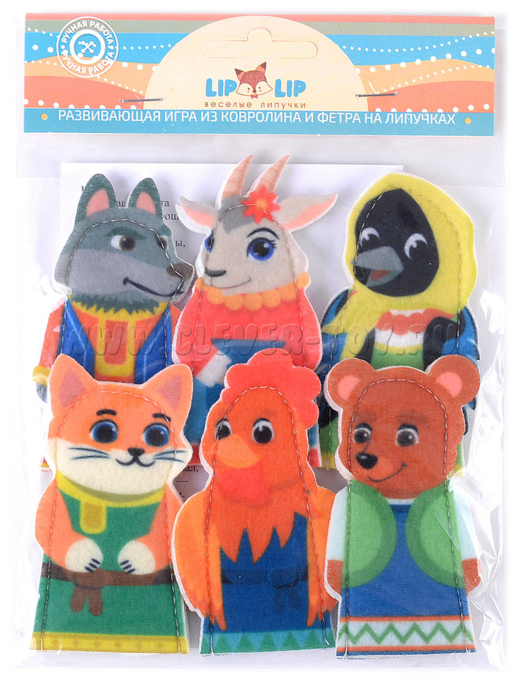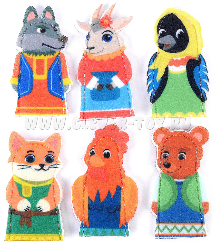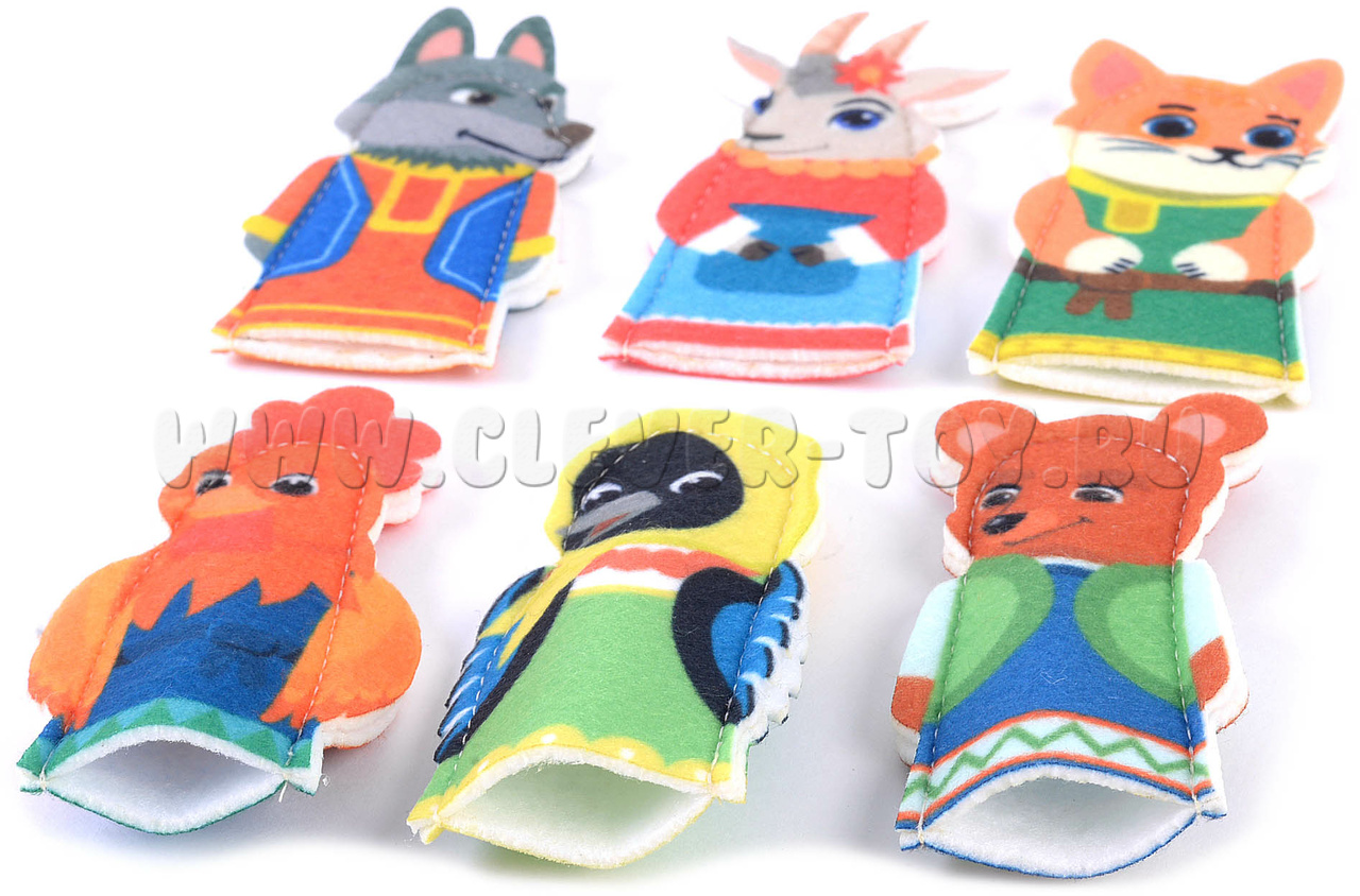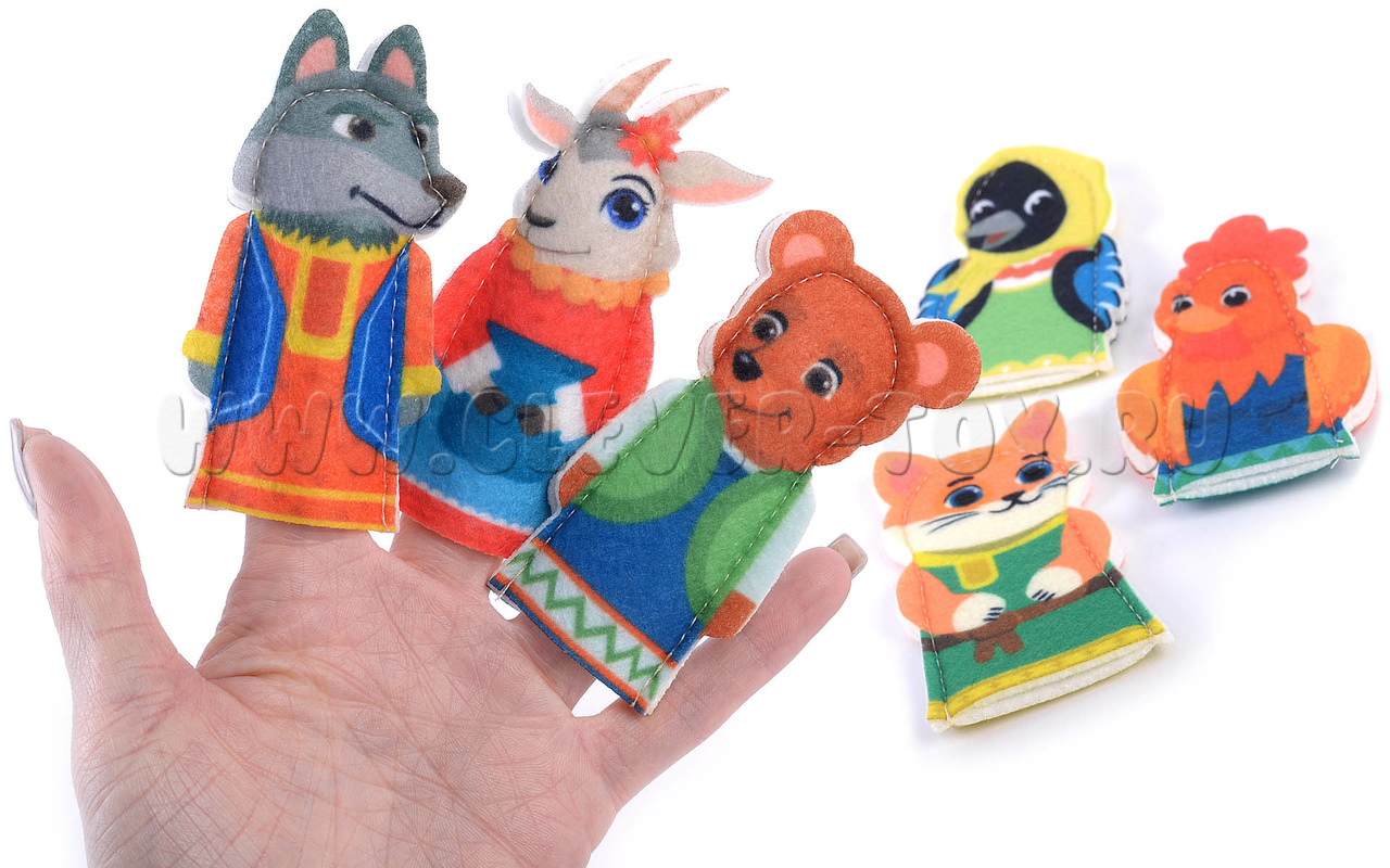 Набор пальчикового театра состоит из: 6 фигурок (размер: 9 см) с изображением сказочных персонажей (Петушок, Котик, Коза, Волк, Мишка) и инструкция с русскими народными потешками. Сочиняйте вместе с ребенком интересные сюжеты, считайте персонажей или пусть ребенок сам решит в какой игре ему применить веселых персонажей.