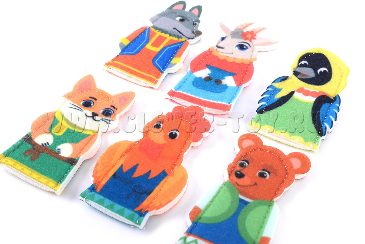 Фигурки персонажей пальчикового театра, выполнены из приятного на ощупь фетра с качественно обработанными краями среза, высокой степенью реализма печати и прошиты для прочности. Фетр из которых изготовлены фигурки, достаточно плотный, благодаря чему они сохраняют свой первоначальный вид даже после многочисленных игр. Цвета, применённые при печати, хорошо различимы и радуют взгляд ребёнка.